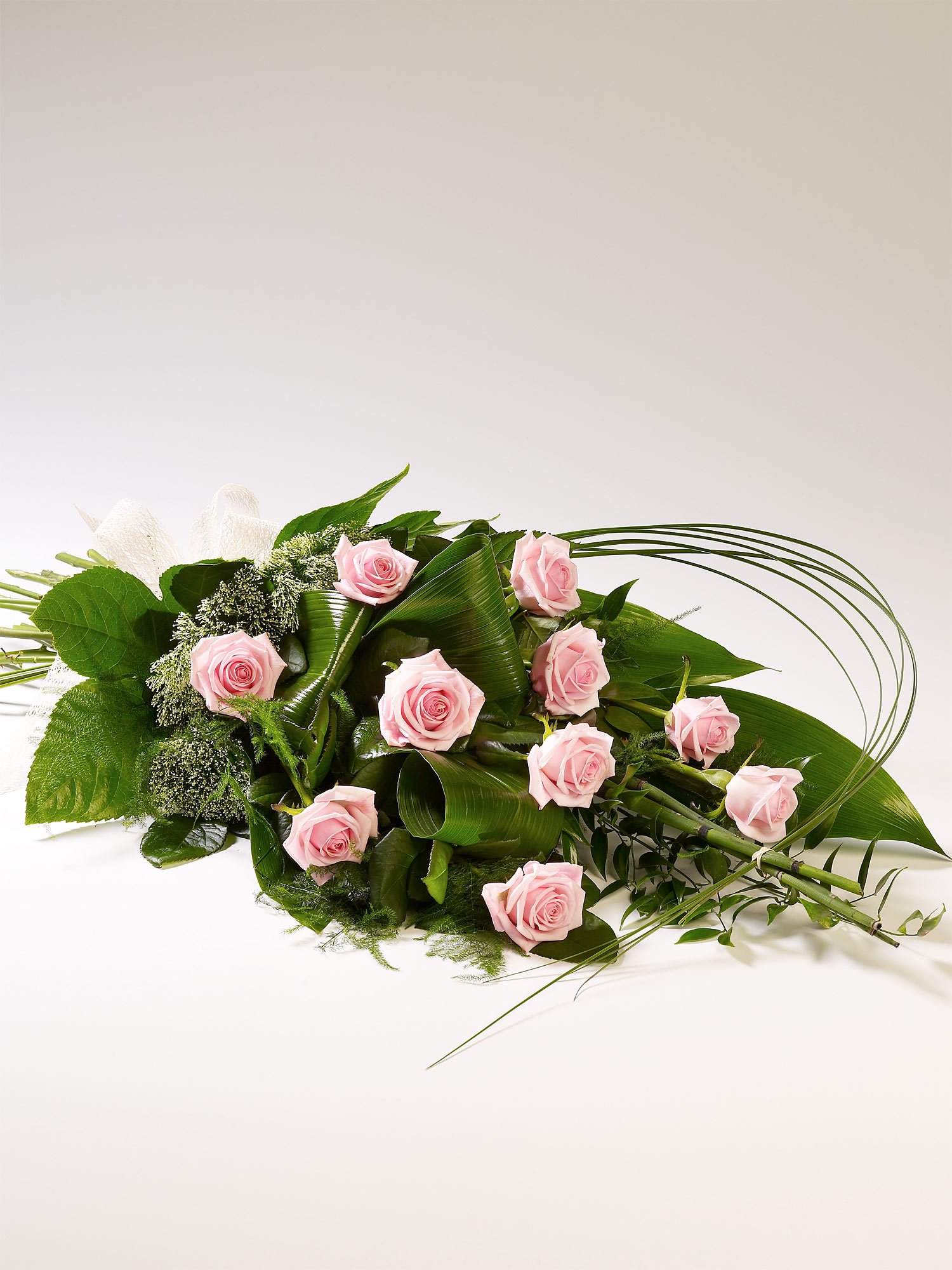 Striking Aspidistra leaves are nestled amongst large-headed pink Roses to create this stunning sheaf which is finished with delicate white Trachelium and curved Steel Grass.