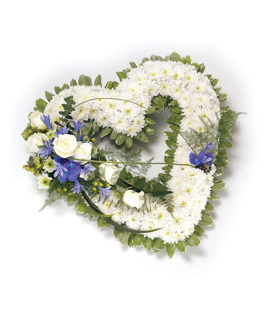 Classic blue and white Chrysanthemum based open heart shape wreath with Roses, complementary foliage and foliage edge.