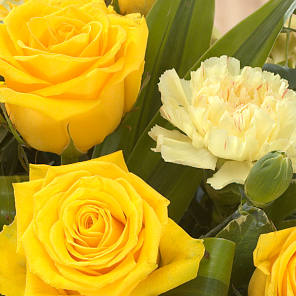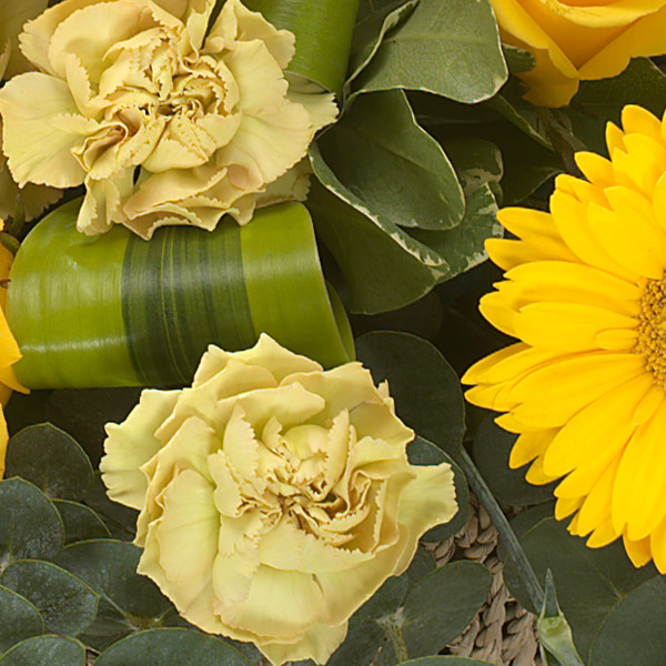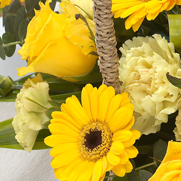 Classic basket arrangement in bright golds: golden Roses and Gerbera fight to outshine the rest of the bunch. Perfect for a Golden wedding anniversary gift.